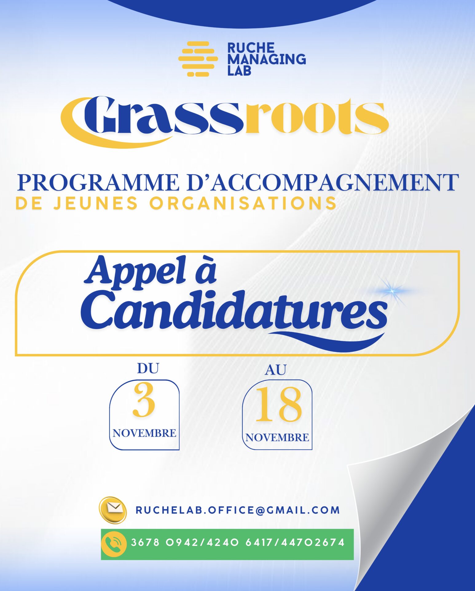 Les organisations intéressées peuvent soumettre leur candidature via ce formulaire disponible également sur les plateformes de Ruche Managing Lab à partir du 3 novembre 2025.