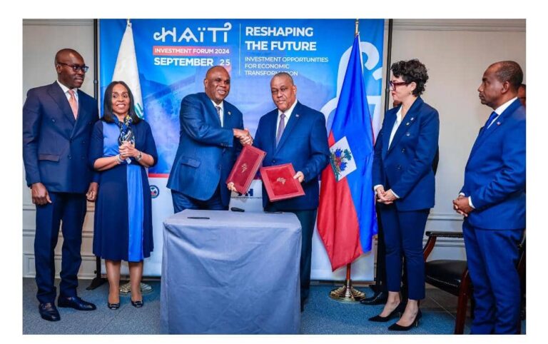 Au cours d’une cérémonie organisée dans le cadre du Forum haïtien sur l’investissement, le Premier ministre de la République d’Haïti, Dr Garry Conille, et le Professeur Benedict Oramah, Président d’Afreximbank et du Conseil d’administration de la Banque, ont apposé leur signature sur les documents officialisant l’adhésion d’Haïti à l’accord de partenariat entre les pays de la CARICOM et la Banque Africaine Import-Export (Afreximbank).