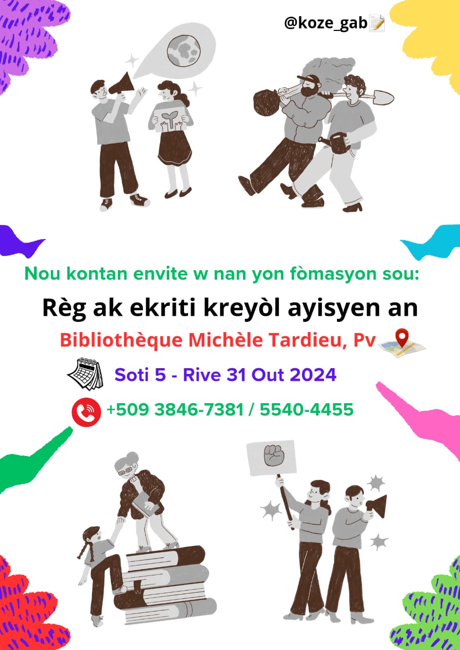 NGJ : Fòmasyon an ap fèt nan « Bibliothèque Michèle Tardieu » a ki Petyonvil, lendi 5 Out pou rive samdi 31 Out 2024, soti 10è nan maten rive 2è nan laprèmidi.